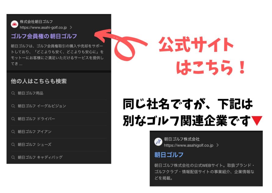 似ている社名に「朝日ゴルフ株式会社」がありますが、こちらはゴルフ用品を取り扱う別会社なのでご注意ください。