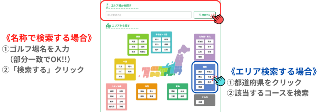 ゴルフ場の検索窓から「ゴルフ場名を入力」するか、エリアから探しましょう。