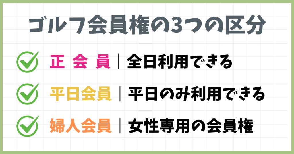 ゴルフ会員権には利用日や属性によって3つの区分がある