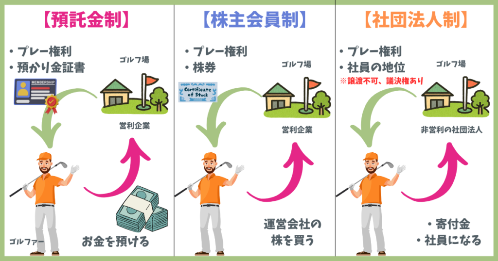 仕組み | ゴルフ場にお金を預けて 会員資格を得られる | ゴルフ場の株主となり 会員資格を得られる | ゴルフ場の社員となり 会員資格を得られる |