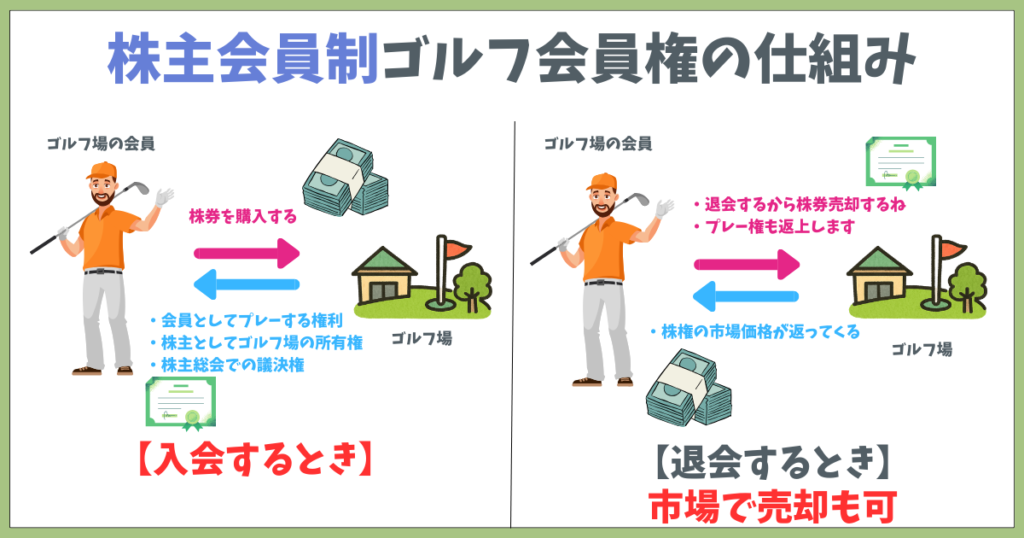株主会員制のゴルフ会員権は、ゴルフ場を運営する会社の株式を購入することで会員になる制度。