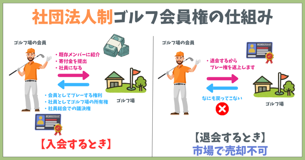 社団法人制のゴルフ会員権は、ゴルフ場を運営する団体が社団法人となり、会員は法人の社員になる制度。