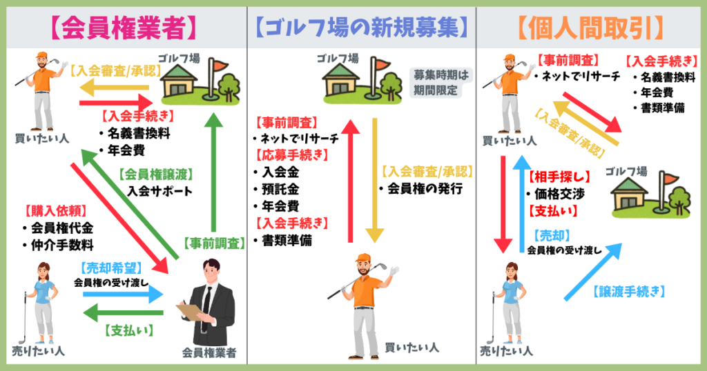 ゴルフ会員権の購入方法は、以下の3つが基本です。